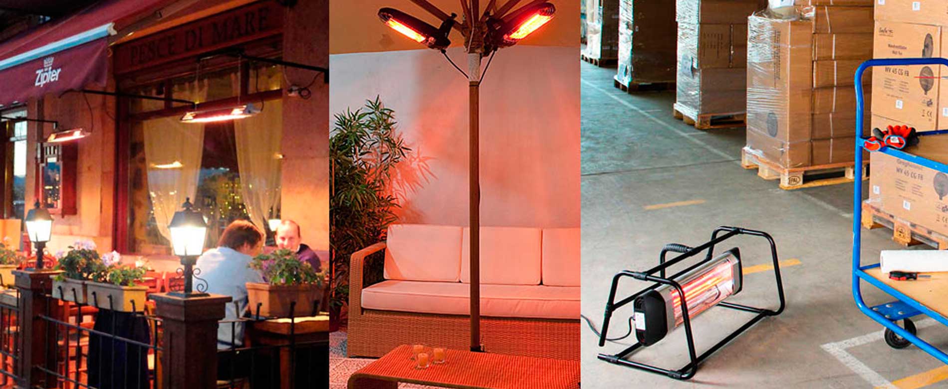 Los calefactores infrarrojos halógenos se caracterizan por las formas variadas y flexibles en que pueden ser utilizados, especialmente al aire libre, donde el aire es dispersado por el viento y por la circulación de corrientes de aire. La radiación directa (penetración profunda) de un infrarrojo halógeno no es afectado por el viento y el clima.
